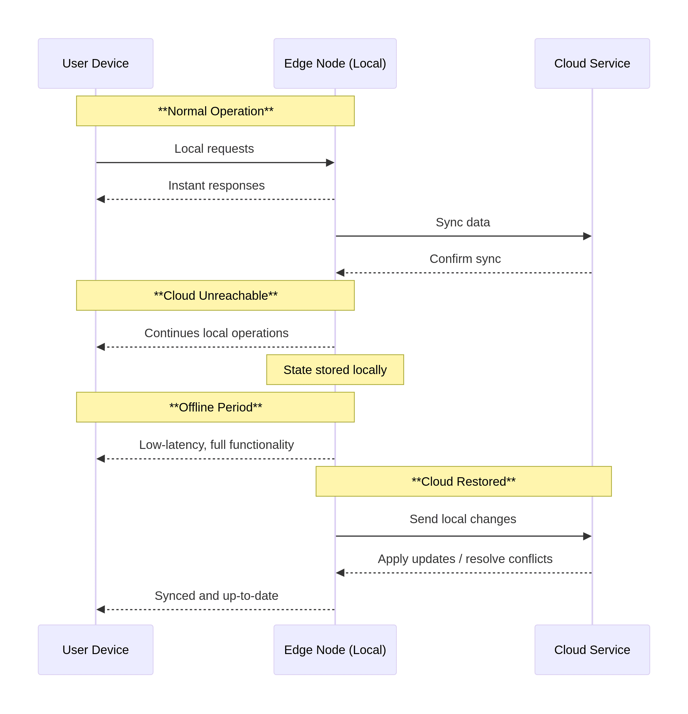 Thus, the main weakness of cloud-first architectures isn’t necessarily the centralized coordination, but the dependency on network connectivity itself. When users lose connectivity to cloud services, whether due to local network issues, ISP problems, or cloud provider outages, applications can become completely unavailable. Even applications designed with offline-first functionality in cloud architectures typically provide limited functionality when disconnected, as the authoritative state remains in the cloud.
